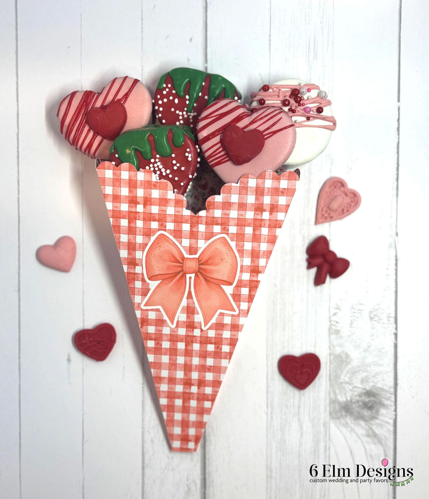 This paper bouquet holder is the perfect way to display and package Valentine’s cake pop bouquets. It also works beautifully for small cookies or sweet treats, making it ideal for gifting, party favors, or bakery sales during the Valentine’s season.