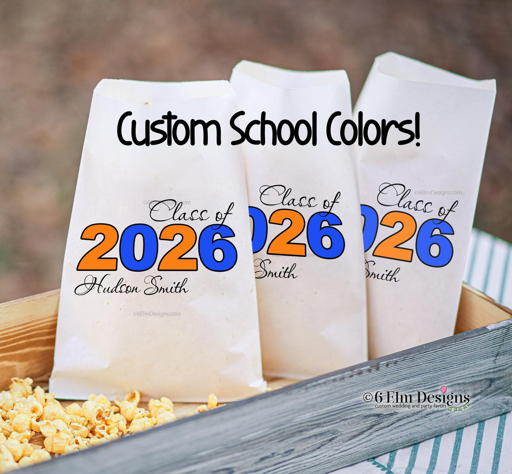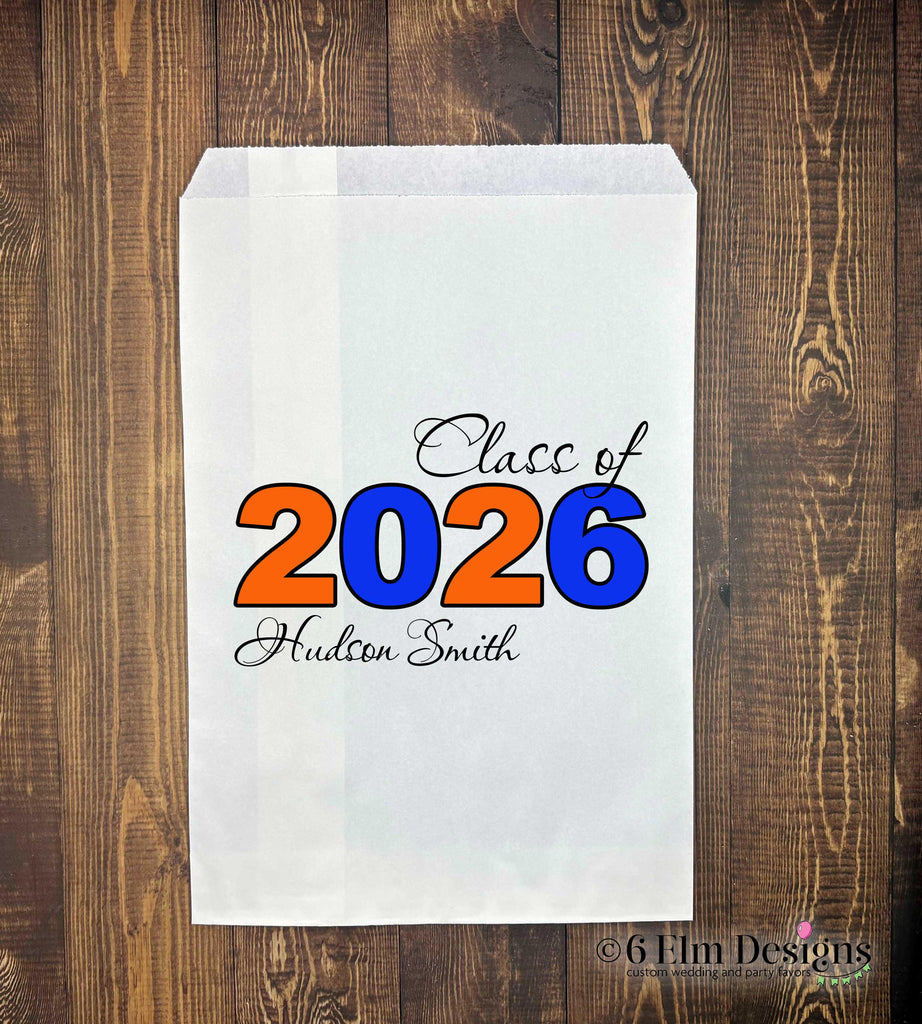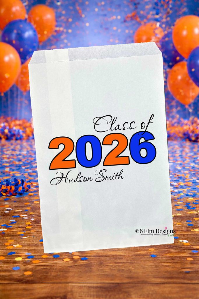 Celebrate the class of 2026 with these customized graduation party favor bags! Add a touch of personalized charm to your graduation meal setup with these beautifully crafted bags, designed to shine on the graduation table. Handcrafted with love and attention to detail, each bag is designed to deliver an unforgettable party experience. Customize colors to match the theme of your graduation party or to reflect the unique personality of your graduate, making these bags a cherished keepsake of this important life event.