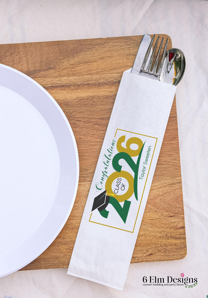 Celebrate the Class of 2026 in style with our high-quality, custom graduation silverware bags. Expertly crafted to enhance your graduation party decor, these bags make a beautiful addition to any graduation meal. The unique rustic silverware design adds a touch of charm to your party landscape, elevating the class of 2026 table decor.