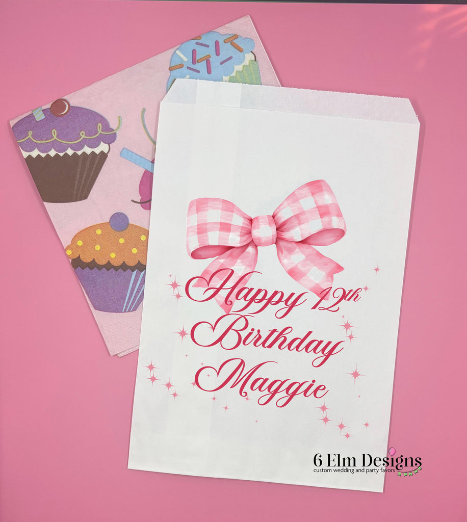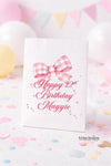 Add the perfect finishing touch to your birthday candy, popcorn, or treat bar with these personalized goodie bags. Each bag features a sweet pink gingham bow design and “Happy Birthday” text, customized with the name and birthday number of your choice. Simple, cute, and guaranteed to make your setup feel extra special.