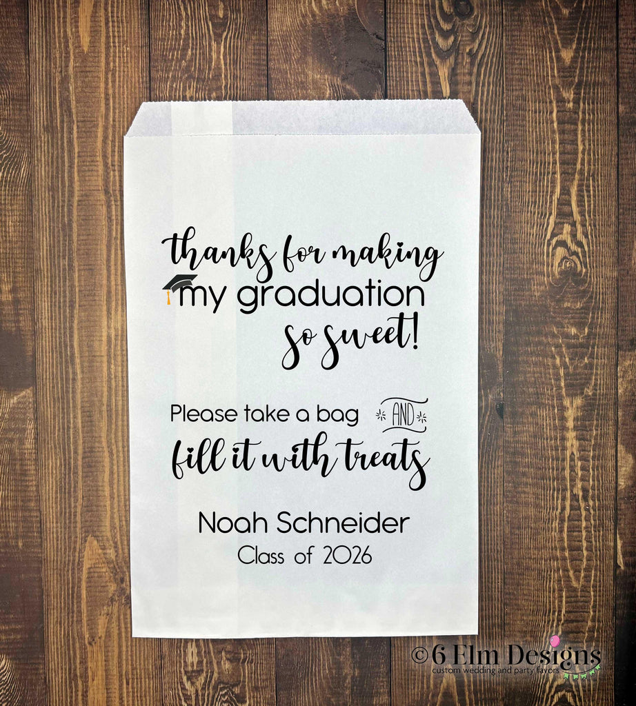 Celebrate your graduate’s big milestone with these beautifully printed Graduation Favor Bags, customized with their name, colors, and class year. Perfect for candy bars, cookie favors, popcorn, mini gifts, and party take-homes, these bags add the perfect finishing touch to any graduation celebration.