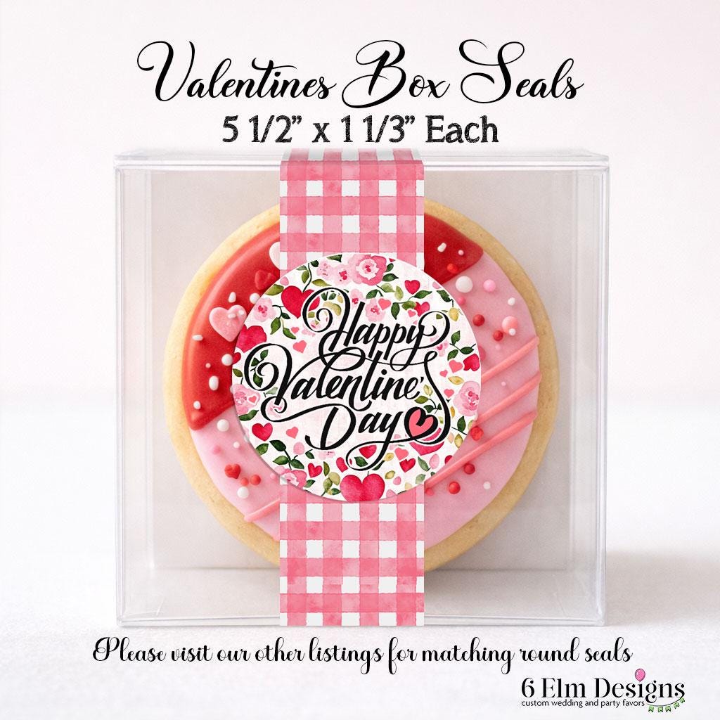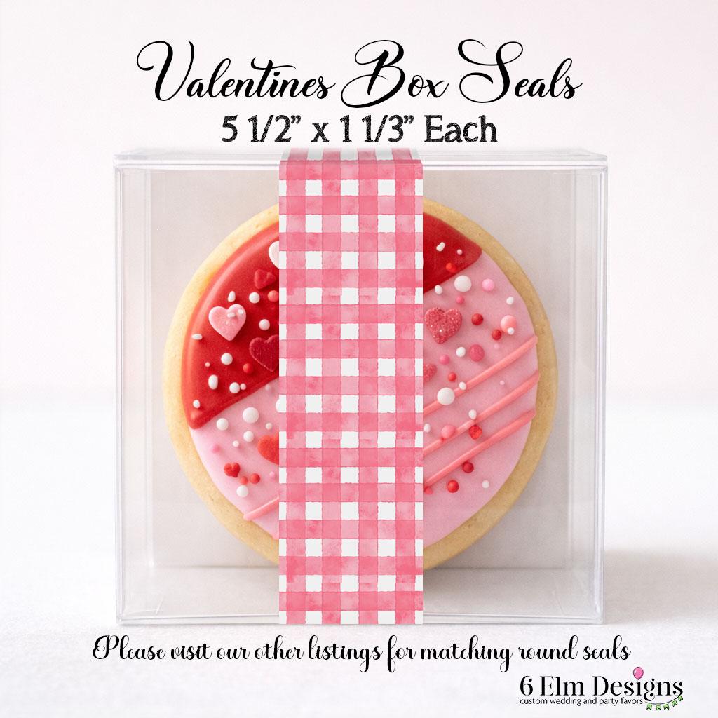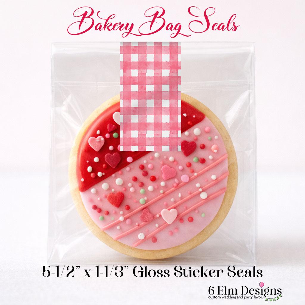 Valentines Sticker Strips: Pink Gingham Cookie & Treat Box Seals - 10 Pack Bakery Box Stickers - Cake Pop Seals